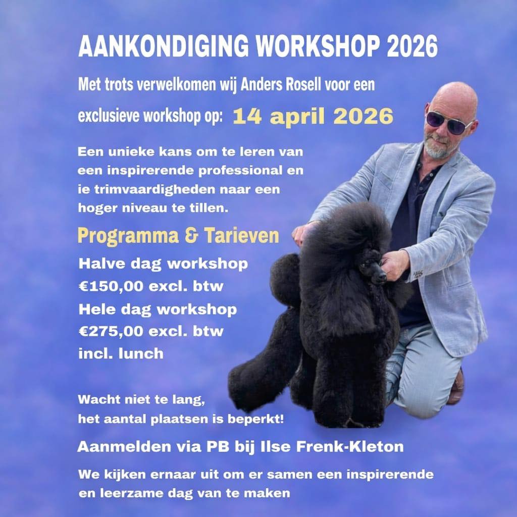 Tijdens deze demo en workshop leer je alles over het trimmen van Doodles en andere populaire salonrassen. Stefan heeft bijna 30 jaar ervaring in het trimvak en deelt tijdens deze dag zijn technieken, visie en praktische aanpak. Je kijkt mee tijdens een demonstratie en krijgt volop gelegenheid om vragen te stellen. Na de demo volgt een gezamenlijke lunch en daarna start het praktijkgedeelte, waarbij je zelf aan de slag gaat onder begeleiding van Stefan. Je mag hiervoor je eigen hond meenemen (bijvoorbeeld een Doodle, Boomer of ander salonras). Deelname Alleen demo €75 excl. btw Demo + lunch + meekijken bij praktijk €85 excl. btw Demo + lunch + hands-on deelname €150 excl. btw Inclusief factuur en certificaat. Gratis parkeren voor de deur. Gegevens Datum 25 april Tijd 10:00 – 17:00 Organisatie Bobbie-Jill Kühn trimsalonwassenaar@gmail.com Locatie Trimsalon Wassenaar